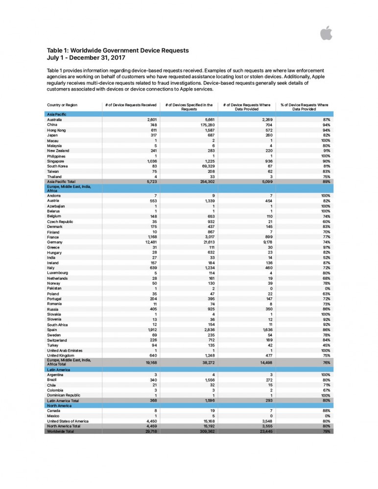 Кстати, любопытная статистика в таблице 4. Там ведется учет обращений с просьбой сохранить всю инфу про конкретный аккаунт на три месяца, пока запросившая сторона готовит бумаги. Видно, что в США сделали за второе полугодие 2017 года более тысячи подобных запросов, а Россия даже не попала в список, потому что не знает, что такая возможность существует. А это очень удобно - сначала просишь Эппл сделать бекап всех данных, потом идешь в суд и получаешь разрешение. В этот момент подозреваемый стирает все свои данные, но не тут-то было - Эппл все выдаст с потрошками.