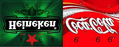 Российский детский телеканал Бибигон. Эмблема три шестерки в виде светящегося солнца с тремя выходящими лучами и ребусной кодировки в самом названии. Эмблемы кока-колы и пива тоже самое.