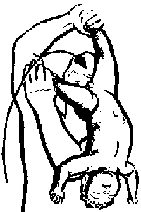 - В положение вниз головой может использоваться и захват двух ножек одной рукой одновременно – указательный палец помещается между щиколоток ребёнка, рука обхватывает обе ножки сразу.