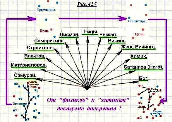 . Рассмотрев несколько конкретных примеров применений схем визуально представления типов личностей зададимся вопросом, что кроме выявления основных отличий полов с соответствующим правильным воспитанием и разделением обязанностей у взрослых людей мы можем получить? Какие другие последствия данное открытие принесёт людям? Очевидно, что из-за постоянных перемещений в пространстве не имеют особого значения точные места расположений целей и ориентиров относительно друг друга. Это позволяет перейти от «божественной и уникальной неповторимости каждой личности» к таблично описательной, строго научной систематизации, где главным станет какая-то константа «концентрации» и превалирования одного над другим (рис.427).