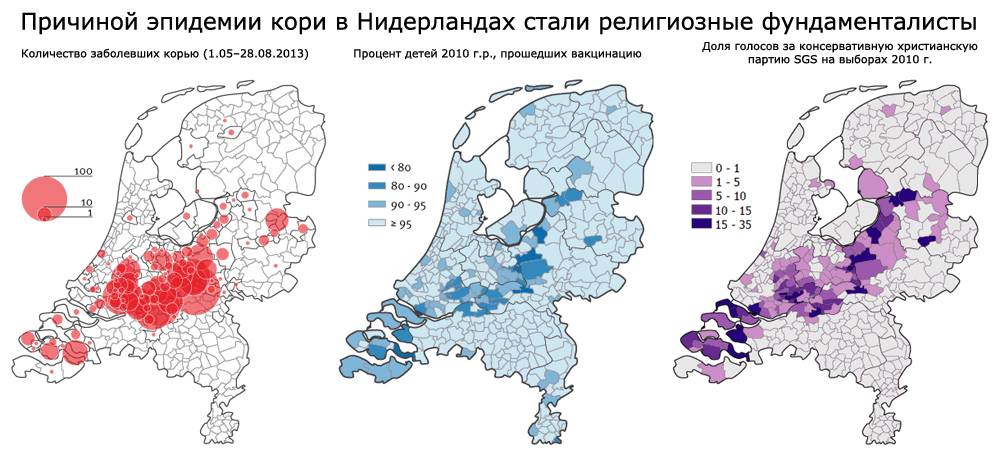 Как указывают медики, распространению эпидемии не помешал тот факт, что по сравнению с мировым, в Нидерландах очень высокий уровень вакцинации против кори — 95 процентов населения не восприимчивы к болезни. Дело в том, что 92 процента заболевших являются глубоко религиозными протестантами и не прививают своих детей ссылаясь на концепцию божественного предопределения. Эти голландцы, около 250 тысяч человек, живут преимущественно в так называемом Библейском поясе страны, и именно там зафиксировано наибольшее число заболеваний и наибольшая доля непривитых.