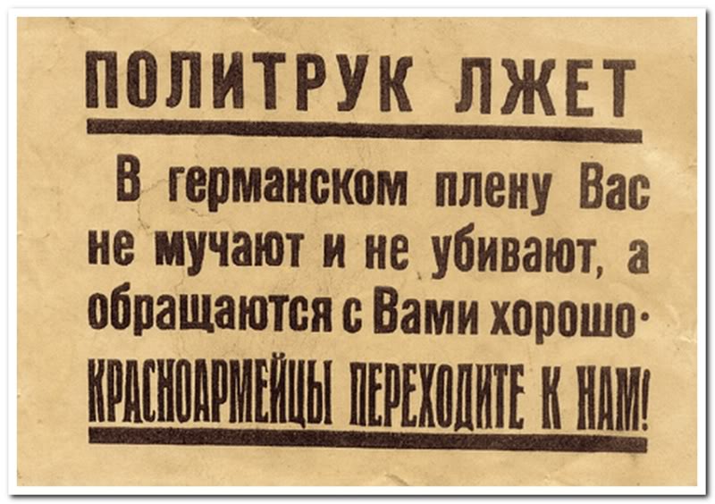 Как уже говорил в цикле статей про мифы, в условиях войны убивать и вообще физически отстранять людей не обязательно - достаточно внушить им нужные мысли, и они сами станут арбайтен унд дисциплинирен на дер гроссише Рейх. А что уж говорить про мирное время, когда бомбой красноармейца не достать? Остаётся только одно - внушить ему, что он никакой не красноармеец, а угнетаемый политруками просвещённый европеец, которому добрый немецкий народ хочет принести свет добра и правды.