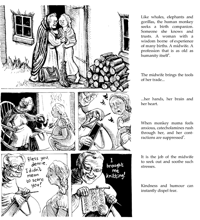 4 Подобно китам, слонам и гориллам,человеческая обезьянка старается найти соучастника на свои роды. Кого она знает и кому доверяет. Женщину с мудростью и знаниями, полученными в самых разных опытах родов. Акушерку.
