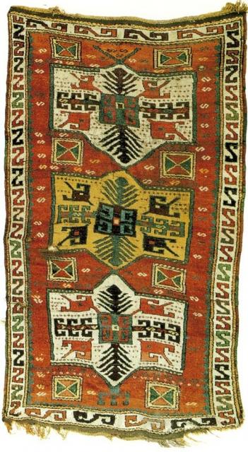 Например, главная тема этого ковра - жизнь и ее защита. Три дерева жизни, стилизированные под крест, олицетворяют жизнь. В центра каждого - колесо фортуны (Çarkıfelek по-турецки). Дерево жизни охраняют волчьи следы, знак скорпиона и дракона. Сверху и снизу дерева жизни - пара птиц, символизирующих жизнь и дух. Знак "крюк" и "глаз" - обережные, от дурного глаза. Бордюр ковра украшают листья платана-чинара.