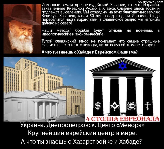 А жить хорошо евреи будут, как учат их рабаи, когда не будет гоев, то есть НЕевреев. И тем, Уотсон, что говорят евреи между собой, надо уже интересоваться, - это щас также легко возможно как и смотреть порносайты, всего лишь один клик: http://www.moshiach.ru/ "ОСВОБОЖДЕНИЕ", о котором так часто говорят раббаи - это как раз вот освобождение от гоев, НЕевреев. Потому что евреи смогут стать счастливы только когда не будет НЕевреев, и евреи тогда смогут выполнить ТЕШУВУ, которая заключается в том, что евреи должны очистить эту планету для своих создателей - ВКЦ ЯГВЕ или Мошиахов, которые и поставили перед своим "чоузанным пиплом" эту непростую задачу. Что тогда те сделают с самими евреями, евреи у Мошиахов не спрашивали, потому что они в не в том положении чтобы обсуждать приказы вышестоящей инстанции. Images4/VerticalVlasti.jpg