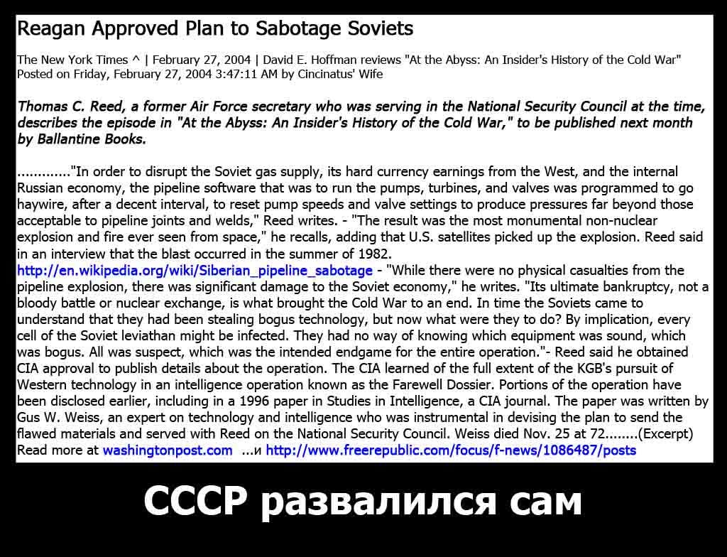 "Сейчас представляют так что дескать Запад выиграл у СССР честно, то есть индустриально, экономически и идеологически и тем самым честно выиграл Холодную Войну и соревнование двух систем. Это не так! США выиграли, обведя вокруг пальца лишь одного человека, откровенно слабого руководителя СССР Михаила Горбачёва. В декабре 1989 года на встрече на Мальте Михаил Горбачёв и президент Буш выразили общее мнение что Холодная Война в прошлом и прошлые враги больше не враги. Однако уже через 2 года президент Буш завил в своём президентском обращении к американцам:"С божей помощью мы - США выиграли Холодную войну у СССР!" ‘By the grace of God, America won the Cold War,’ Bush said during his 1992 State of the Union address. И поэтому тут же продоложили её в горячую войну. Президент Клинтон стал бомбить Югославию без одобрения Совета Безопасности ООН и начал экспансию американской военщины на территорию бывших стран Варшавского Договора. О США в тот момент уже можно было сказать как и о Гитлере в 1938 году, что США растоптало все горбачёвские договорённости! "Доверие русских к США было потеряно навсегда!" - констатировал американский посол в Москве Мэтлок.