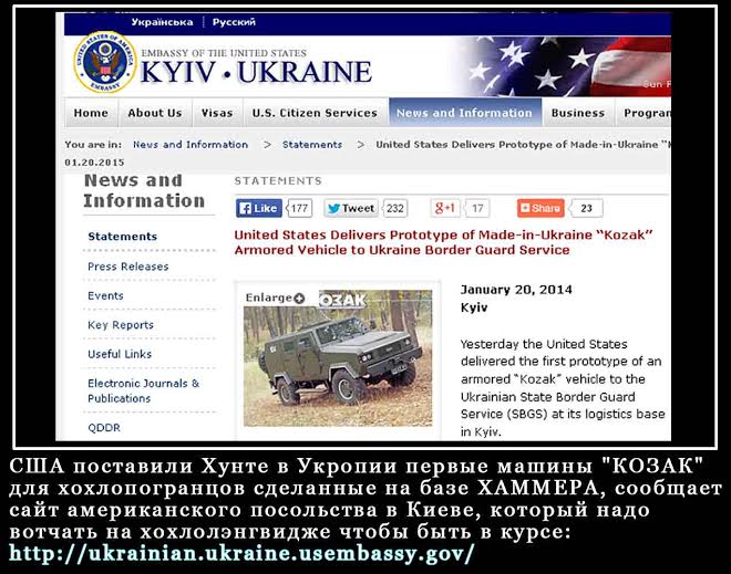 "США поставили Хунте в Укропии первые машины "КОЗАК" для хохло-амеро-погранцов сделанные на базе ХАММЕРА, сообщает американское посольство в Киеве: http://ukraine.usembassy.gov/statements/kozak-01202015.html