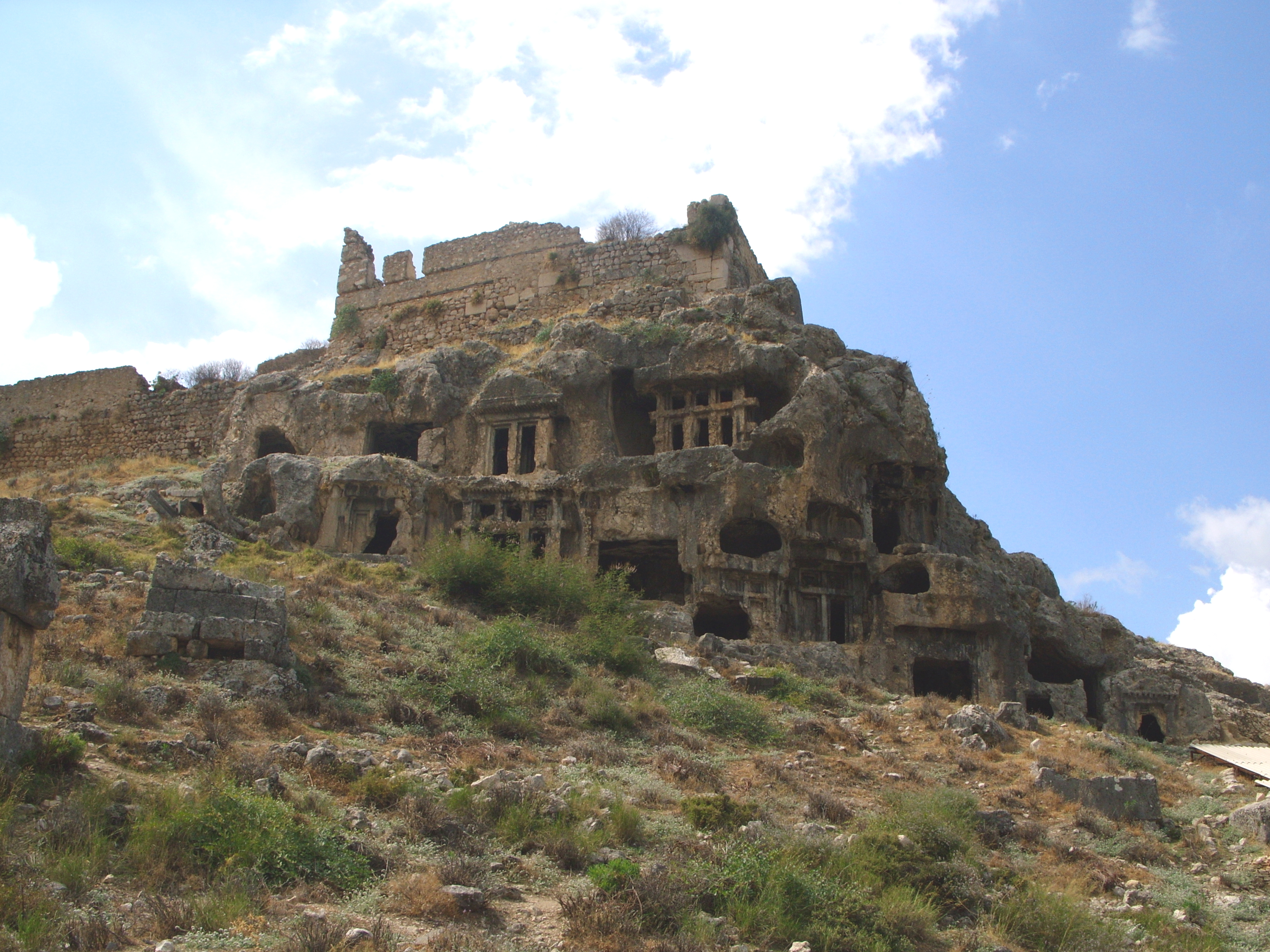 Вот смотрите на этом снимке - это Крым - Мангуп кале. Это разравненный большой холм на который положена искусственная платформа. Fotoalbum3/images/KrymMangupBloki2_jpg.jpg А это Турция, Хераклеа - тут платформа взорвана и пошла как "крышей домика"!