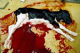 Мясо - это части тел животных, как правило, выращенных на специальных фермах. Затем эти животные оказались на бойне, где были жестоко убиты. Из темно-зеленых частей их тел сделали товар, который наряду с другими товарами оказался на рынке в виде мяса, подкрашенного селитрой.